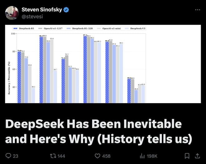 微软 Windows 部门前总裁,曾带领开发出 Windows 7、Windows 8 的科技老兵 Steven Sinofsky 近日在 X 上发表长文《DeepSeek 是不可避免的,原因如下)》,从技术史的角度,看到了 AI 行业如今的窘境,和 DeepSeek 问世的必然。