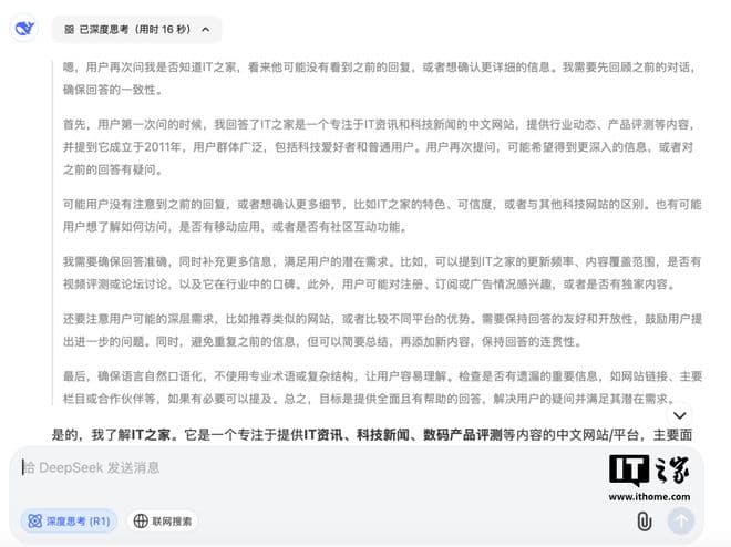 此外,作为一款采用CoT 思维链技术的推理模型,DeepSeek-R1 直接把其思考过程显示给用户,这一点令我们可以直观感受到目前大模型技术的实力。