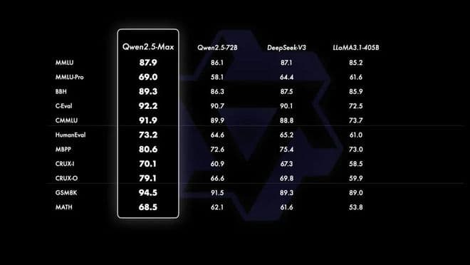 与业界领先的模型(包括 DeepSeek V3、GPT-4o 和 Claude-3.5-Sonnet)相比,Qwen2.5-Max 的性能表现也相当有竞争能力。