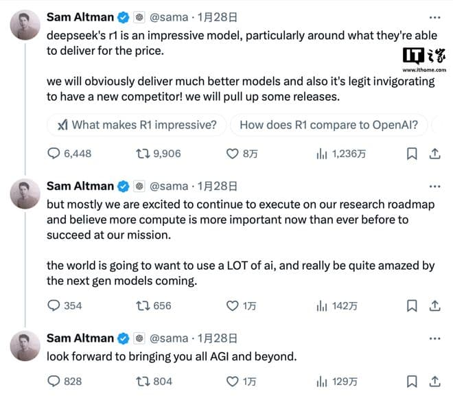 OpenAI 的 CEO 阿尔特曼也对 DeepSeek-R1 进行了评价: