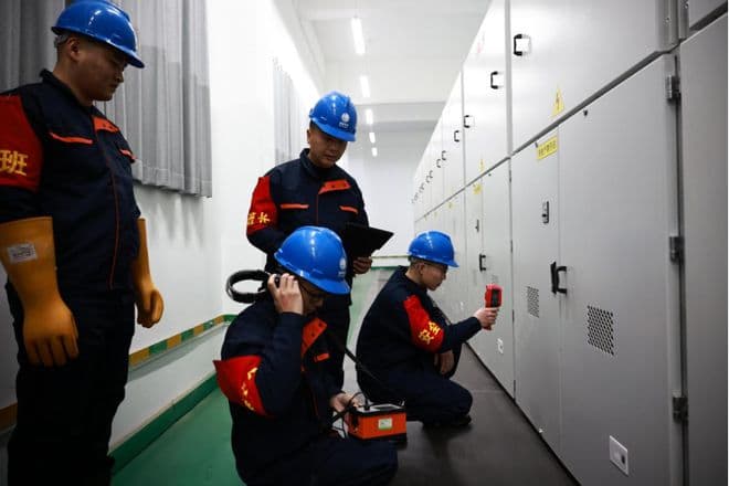 在另一处,后端岗位的施涛正在检查供配电设备。自他2004年来到戈壁参与场区建设以来,21年里,他仅仅3次回家过年。除夕夜,他在数个塔架间巡视线路,检查上百个供配电设备。即便外面早已零下十几度,刺骨的寒风不断袭来,他的神情依旧专注,动作依旧娴熟,仿佛忘记了疲惫与寒冷。