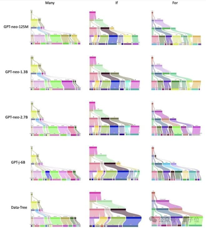 作者发现,在同一数据集(the Pile)上训练的不同语言模型(GPT-neo-X系列模型)在GPT-Tree可视化中具有显著的结构相似性。