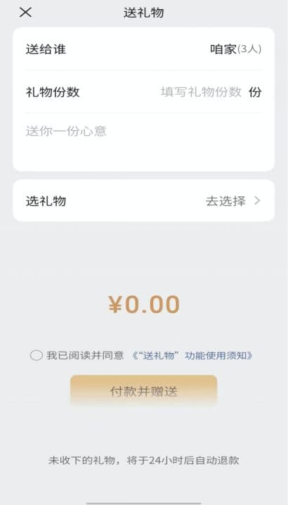 微信送礼物功能上线初期,步子迈得相当谨慎,在微信里无明显入口,也无法在群聊中使用。