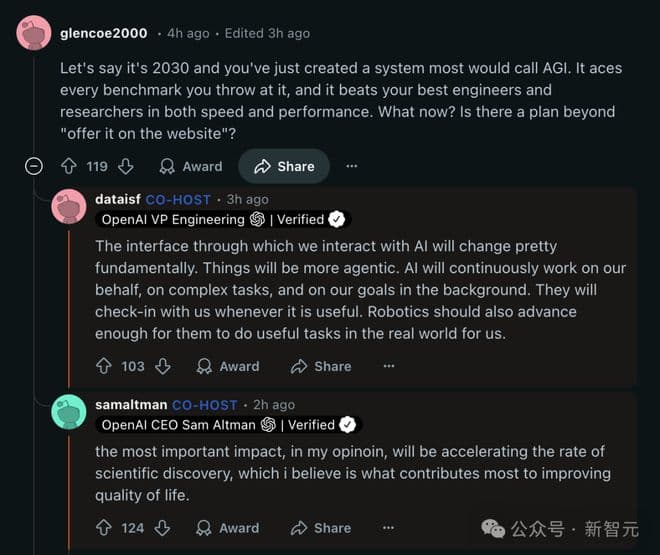 除了奥特曼本人,首席研究官Mark Chen、首席产品官Kevin Weil、工程副总Srinivas Narayanan、API研究负责人Michelle Pokrass、研究负责人Hongyu Ren也一同在线,认真回答了网友们所有问题。