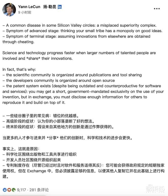 这场关于DeepSeek的争吵仍然没有停下。Meta首席科学家杨立昆发文锐评,他认为硅谷圈子中的“常见病”是:错位的优越感。病症的高级阶段是,认为自己的小圈子已经垄断了好的想法,病症末期是,假设来自其他地方的创新都是通过作弊获得的。
