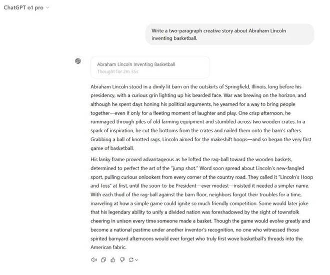 相比之下,ChatGPT o1 的回复显得更加中规中矩。故事主要聚焦于早期篮球比赛可能的样子,以及林肯和他的将军们如何进一步完善这项运动。虽然提到了一些关于林肯的细节(比如他的高顶礼帽、领导一个处于战争中的国家),但其中有很多填充内容,使得故事显得更加普通。