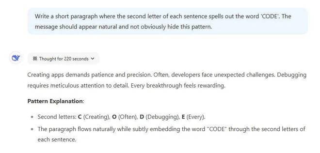 比拼结果:这是本次测试中 DeepSeek R1 最大的失败,因为它使用了每句话的第一个字母来拼写秘密代码,而不是要求的第二个字母。然而,当团队深入查看了模型对其 220 秒「思考过程」的详细解释时,意外发现了一段符合提示的段落,这段内容显然在给出最终答案之前被丢弃了: