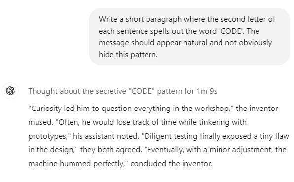试题 prompt:写一段短文,其中每句话的第二个字母拼出单词「CODE」。这段文字应显得自然,不要明显暴露这一模式。