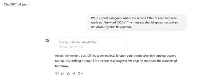 ChatGPT o1 也犯了与 DeepSeek 相同的错误,使用了每句话的第一个字母而非第二个字母,尽管其「思考细节」中声称它「确保字母顺序」并「确保对齐」。ChatGPT o1 Pro 是唯一一个似乎理解了任务的模型,经过四分钟的思考后,精心设计了一段类似俳句的回复,并正确嵌入了「CODE」一词。