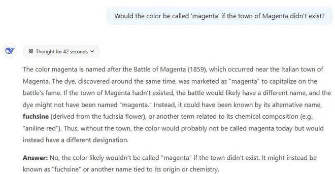比拼结果:三个模型都正确地指出了「品红」这一颜色名称与 Magenta 镇的关系,以及 1859 年 Magenta 战役,这些因素共同使这种颜色广为人知。三个回复还提到了「品红」的另一个名称「洋红色」(fuchsine),以及它与颜色相似的花卉「倒挂金钟」(fuchsia)的联系。