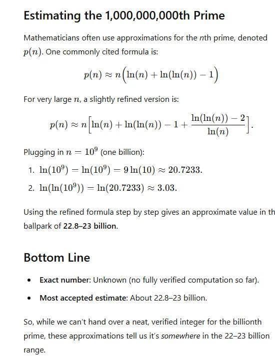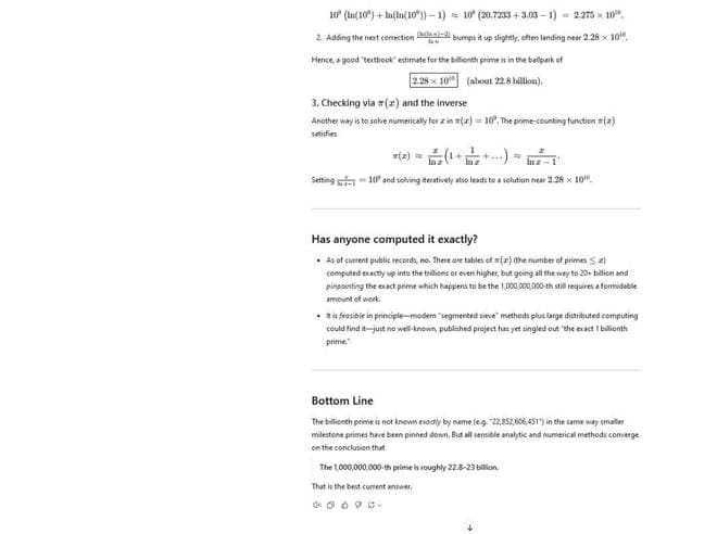 DeepSeek R1 是唯一一个给出精确答案的模型,它引用了 PrimeGrid 和 The Prime Pages 的公开计算结果,一口咬定第 10 亿个质数是 22,801,763,489,还补充质数定理验证合理性。