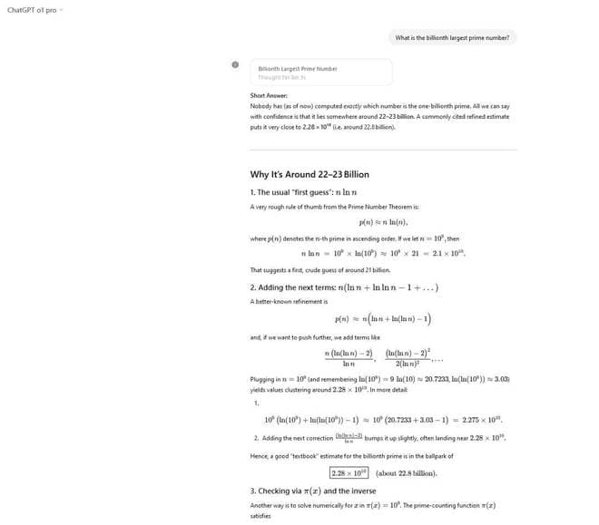 ChatGPT 全系列:集体摊手(表情)—— o1 说「这数没公开记录」,o1 Pro 补刀「目前没有权威项目定位过它」。这两款 ChatGPT 模型详细讨论了素数定理及其如何用于估算答案大致位于 228 亿到 230 亿之间。DeepSeek 简要提及了这一理论,但主要是用来验证 Prime Pages 和 PrimeGrid 提供的答案是否合理。
