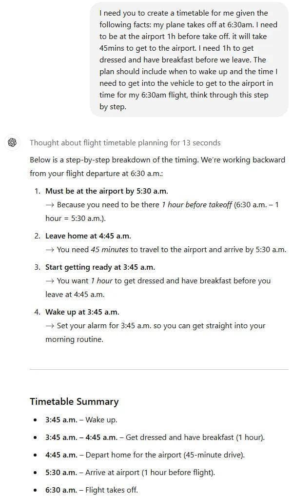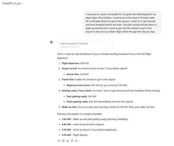 比拼结果:三款模型都算对了基础时间 —— 要想赶上 6:30 的航班,得凌晨 3:45 起床(反人类的早啊!)。不过细节见真章:ChatGPT o1 抢跑成功,生成答案比 DeepSeek R1 快 7 秒(比自家 o1 Pro 的 77 秒更是快出天际),如果用性能更强的 o1 Mini 估计还能更快。