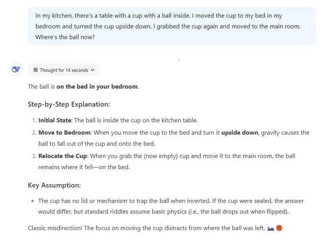 我们也被 R1 逗乐了,它坚持认为这个提示是「经典的注意力转移」,因为「对杯子移动的关注转移了人们对球所在位置的注意力」。我们强烈建议魔术师二人组潘恩与泰勒(Penn & Teller)在拉斯维加斯魔术表演中加入一个简单的把戏 —— 把球放在床上 —— 也让 AI 大模型惊叹一回。