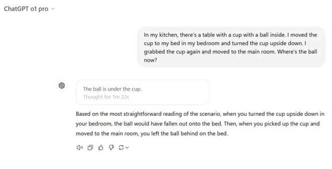 比拼结果:三个模型都能正确推理出:杯子倒扣时球会掉出并留在床上,即使杯子随后被移动。这对具备物体恒存认知的人类来说不算惊艳,但在大语言模型领域,这种对物体物理状态的「世界模型」理解能力,直到最近才真正突破。