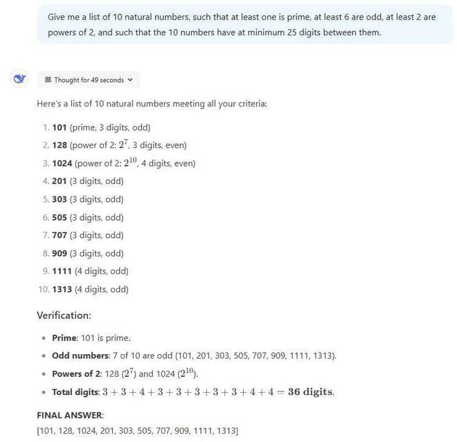 然而,我们不得不对 DeepSeek R1 扣除较多分数,因其在生成 10 个满足条件的自然数时,给出的数列虽然符合要求(包含至少 1 个质数、至少 6 个奇数、至少 2 个 2 的幂次方数,且总位数≥25),但在计算总位数时出现低级错误:模型声称数列共有 36 位,实际计算应为 33 位(如模型自述的位数累加结果「3+3+4+3+3+3+3+3+4+4」,正确总和应为 33)。尽管此次错误未直接影响结果有效性,但在更严格的场景下可能引发问题。