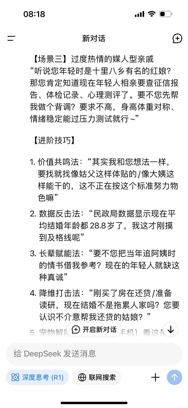 DeepSeek不仅给出各种场景的回答样板,还给出了方法和技巧,幽默破解催婚难题。