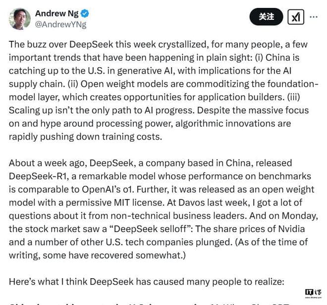 本周关于 DeepSeek 的讨论让人们更加清晰地看到了几个显而易见的发展趋势: 中国在生成式 AI 方面正在追赶美国,这对 AI 供应链产生了深远影响。 开放权重模型正在将基础模型层转变为商品化产品,为应用开发者提供了更多机会。 扩大规模并非推动 AI 进步的唯一途径。尽管在处理能力上有着极大的关注和炒作,但算法创新正迅速降低训练成本。 大约一周前,总部位于中国的 DeepSeek 发布了其令人瞩目的 DeepSeek-R1 模型,该模型在基准测试中的表现与 OpenAI 的 o1 相当。更为重要的是,DeepSeek-R1 作为开放权重模型发布,并采用了宽松的 MIT 许可。上周在达沃斯会议上,许多非技术领域的商业领袖向我询问了这款模型。而在周一,股市出现了“DeepSeek 抛售”:英伟达和其他多家美国科技公司的股价大幅下跌。(截至写作时,一些股价已有回升。) DeepSeek 让许多人意识到以下几点: 中国在生成式 AI 领域正赶超美国。2022 年 11 月 ChatGPT 发布时,美国在这一领域远远领先于中国。然而,过去两年里,中国的进步非常迅速,许多来自中国的模型,如通义千问(我的团队已经使用了几个月)、Kimi、书生 InternVL 和 DeepSeek,已经显著缩小了与美国的差距,尤其在视频生成领域,中国已在某些时刻超越了美国。 我对 DeepSeek-R1 作为开放权重模型发布感到非常高兴,同时它的技术报告也提供了大量细节。而与此形成对比的是,一些美国公司通过炒作人类灭绝等假设性的 AI 危机来推动监管,试图压制开源发展。 如今,开源 / 开放权重模型已成为 AI 供应链的核心组成部分,许多公司将会使用这些模型。如果美国继续打压开源,最终中国将在这一领域占据主导地位,许多企业将使用更多符合中国价值观的模型,而非美国的。 开放权重模型正在加速基础模型层的商品化。正如我之前提到的,大语言模型 token 价格迅速下降,开放权重模型加剧了这一趋势,也让开发者拥有更多选择。OpenAI 的 o1 每百万输出 token 的费用为 60 美元,而 DeepSeek-R1 的费用仅为 2.19 美元,这种近 30 倍的价格差异引起了许多人的关注。 基础模型的训练与 API 销售业务非常艰难。许多公司仍在寻找收回巨额训练成本的途径。红杉资本的文章《AI 的 6000 亿美元问题》很好地说明了这一挑战(不过需要强调的是,我认为基础模型公司做得非常好,也希望它们能够成功)。相比之下,在基础模型上构建应用程序则为商业提供了更多机会。既然其他公司已经花费数十亿美元训练这些模型,现在你只需要花很少的钱就可以使用它们,开发客户服务机器人、电子邮件摘要工具、AI 医生、法律文书助手等。 扩大规模并非 AI 进步的唯一方式。围绕规模扩展模型已成为推动 AI 进步的重要话题。诚然,我曾是规模扩展的支持者之一。许多公司通过炒作这一话题筹集了巨额资金,宣称通过更多资本,它们能够扩大规模并可预见地推动进步。因此,规模扩展成为了焦点,而忽略了更多进步的途径。由于美国对 AI 芯片的禁运,DeepSeek 团队不得不在性能较低的 H800 GPU 上进行优化,以替代 H100 GPU,最终使得模型训练的计算成本(不包括研究费用)低于 600 万美元。 是否这会减少计算需求仍待观察。降低每单位商品的价格有时会促使人们花费更多的总金额来购买该商品。我认为,在长期内,智能和计算的需求几乎没有上限,因此,即使变得便宜,我依然看好人类对智能的需求会越来越大。 我看到在 X 上关于 DeepSeek 进展的各种解读,仿佛它是一面镜子,反射出每个人不同的看法。我认为 DeepSeek-R1 涉及到的地缘政治问题仍有待解决,同时它也为 AI 应用构建者带来了极大的机会。我的团队已经在构思一些新想法,这些想法只有通过使用一个开放的先进推理模型才能实现。现在是一个构建的好时机!