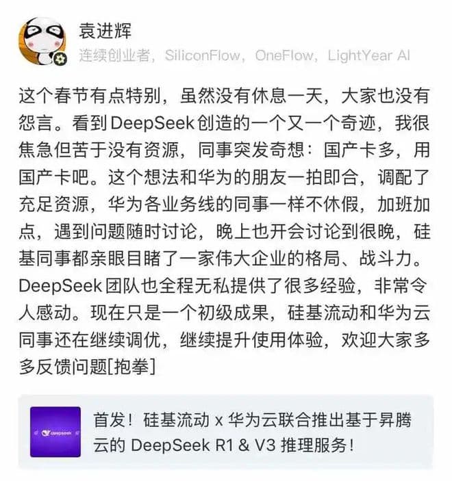 硅基流动创始人、CEO 袁进辉在社交媒体也透露了合作开发过程。