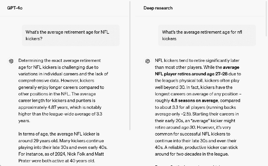在这个例子中,deep research 提供了需要考虑的组成部分和因素,而不仅仅是一个数字。它更加全面,提供了清晰的统计背景,使用了支持性的例子,并直接解释了射门员相对于其他位置球员职业生涯较长的原因。这种细节和清晰度使得 deep research 更具信息量,并更直接地回应了那些希望了解 NFL 退休年龄趋势的人的需求。