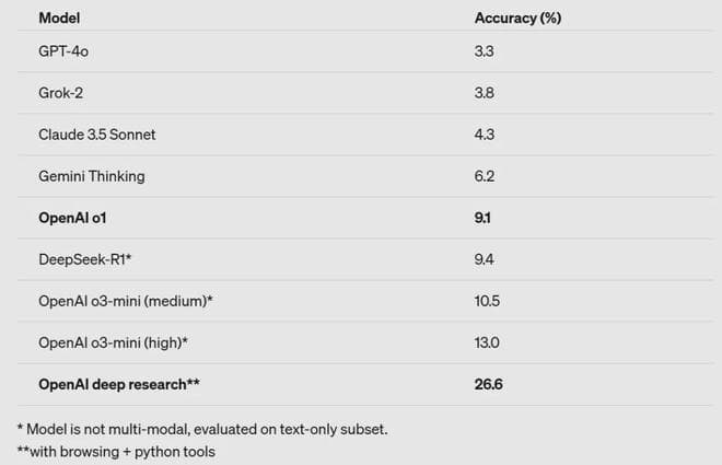 对于最近发布的「人类终极考试」评估,在专家级问题上对广泛学科的人工智能进行了测试,支持 Deep Research 的模型以 26.6% 的准确率创下了新高。