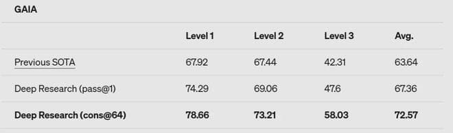 在评估人工智能在现实问题上表现的公共基准 GAIA 上,支持 Deep Research 的模型达到了新的 SOTA 水平,位居排行榜榜首。这些任务涵盖三个难度级别的问题,成功完成需要具备推理、多模式流畅性、网页浏览和工具使用熟练等能力。