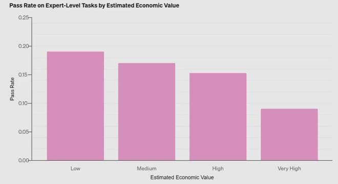 以下两图分别为专家级任务的通过率(按估计经济价值计算)以及专家级任务的预计小时数通过率。