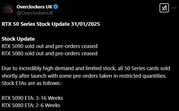 比如在英国,最大的零售商OCUK在新卡发售前就警告说,他们手里只有不到10块RTX 5090,而且不确定什么时候才能到货多少。