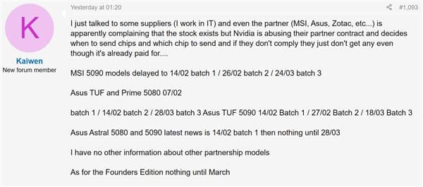 造成这种局面的原因很多,一方面是中国春节、NVIDIA与AIC沟通问题导致本就产能紧张,二是黄牛泛滥城寨,甚至整个欧洲的RTX 5090、5080公版卡在发售前就被黄牛机器人提前抢空了。