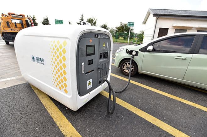 一台移动充电机器人正在给一辆新能源小轿车充电。资料图(视觉中国)