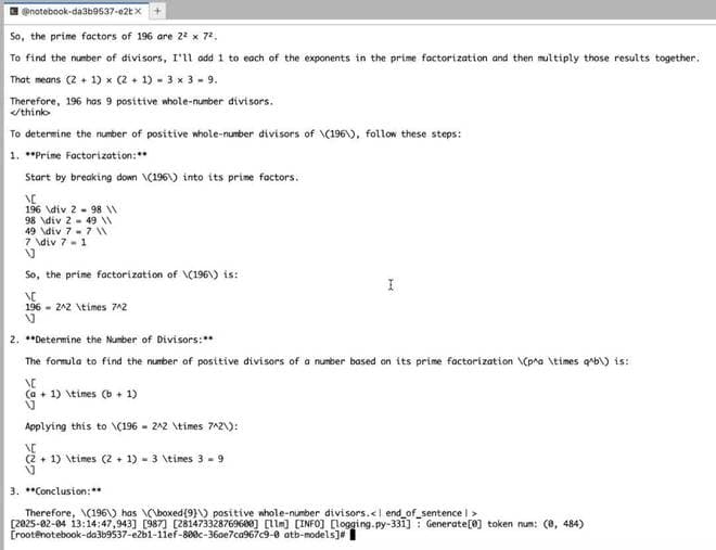 例如,登录潞晨云后选取 “ASCEND-910B” 实例,使用 DeepSeek-R1-Distill-Qwen-7B 模型及镜像,推理问题:How many positive whole-number divisors does 196 have? Put answer in \box {Your answer}(196 有多少个正整数因数?),从相应输出可以看到模型已进行深度思考并找到正确答案。通过选取相应实例和镜像,可进一步私有化部署满血 671B DeepSeek R1 模型。
