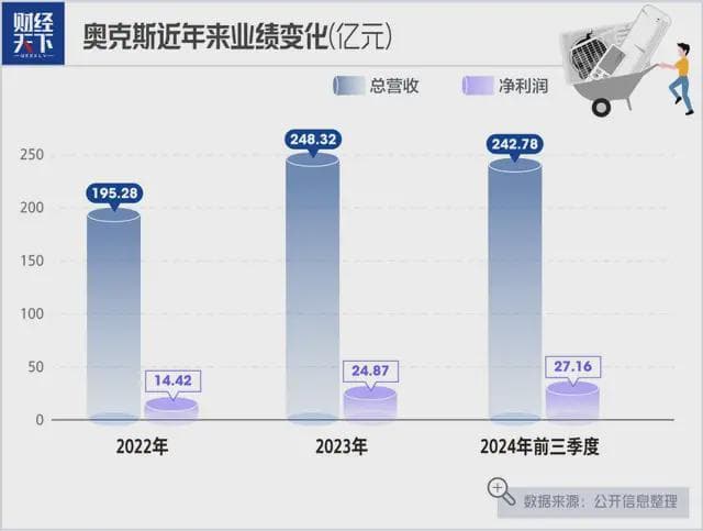 2022年和2023年,奥克斯分别实现了195.28亿和248.32亿元的营收,净利润也由14.42亿元增长到24.87亿元。在2024年,仅仅前三季度,奥克斯就实现了242.78亿元营收,同比增长了15.4%;净利润达到27.16亿元,同比增长17.8%,相当于平均每月净赚3亿元,平均每天净赚1000万元。