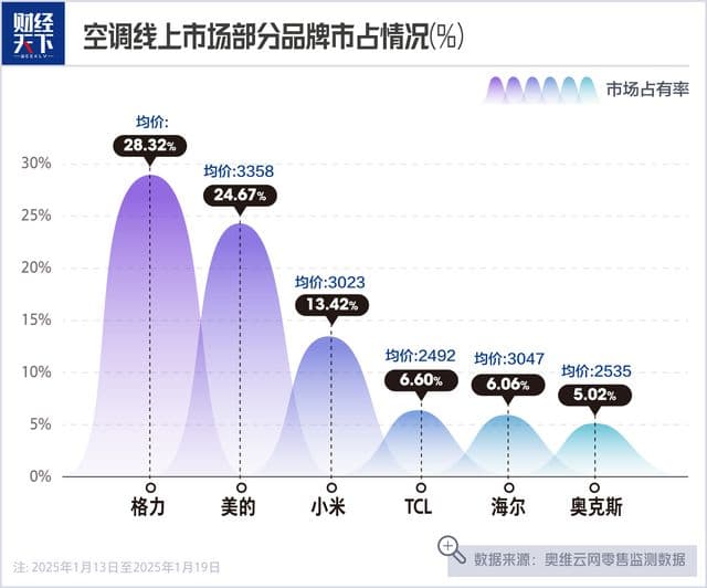 奥维云网数据显示,国内空调产品2024年的线上均价为2775元;线下均价4306元。在全部品牌中,线上市占率前五分别为美的、格力、小米、华凌和奥克斯,而奥克斯空调的线上均价只有2207元,是前五大厂商中最低的;线下市场中,其均价也只有2982元。