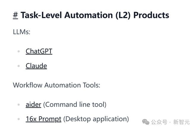 L2级别的工具专注于任务级自动化,LLM如ChatGPT便属于这一范畴。