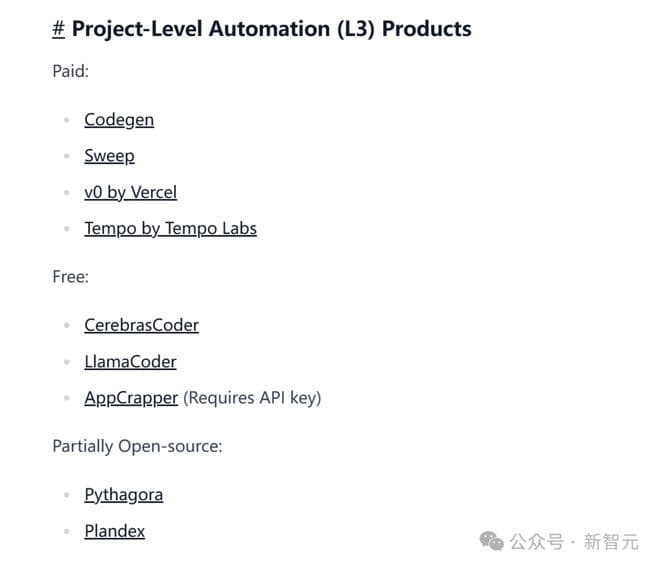 L3代表着项目级自动化的早期阶段,像Codegen、Sweep 和 Pythagora这样的工具,具备分析项目需求并生成相关拉取请求的能力。