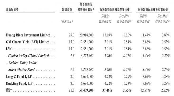 在其订立的基石投资协议中,基石投资者已经同意在若干条件限制下认购或促使其指定实体认购按发售价可购买的相关数目发售股份,总额最多约7100万美元。古茗控股基石投资者包括Huang River Investment Limited(为腾讯全资拥有)、GM Charm Yield (BVI) Limited、LVC、Long-Z Fund I, LP、Duckling Fund,一共认购7100万美元。