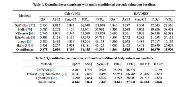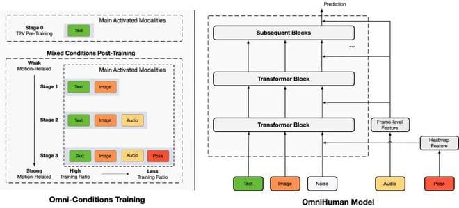据技术报告,OmniHuman,面向端到端人像驱动任务中高质量数据稀缺的问题,采用了一种 Omni-Conditions Training 的混合多模态训练策略,并相应的设计了一个 OmniHuman 模型,通过这种混合多模态训练的设计,可以将多种模态的数据一起加入模型进行训练,从而大幅度的增加了人像驱动模型的可训练数据,使得模型可以从大规模数据中受益,对各种类似的输入形式有了比较好的支持。