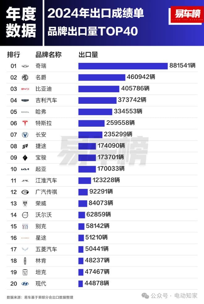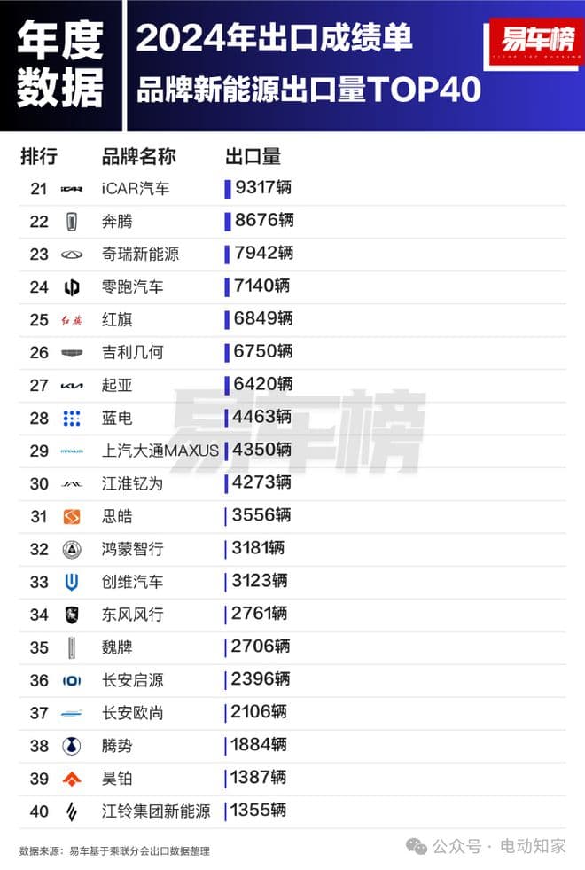 电动知家消息,2024年2月5日,易车发布2024年汽车品牌出口量及新能源出口量TOP40。根据易车整理的乘联分会出口数据显示: