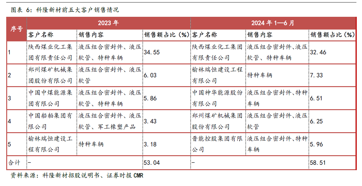 公司主要客户为大型煤矿和煤机企业,目前已与陕煤集团、郑煤机、北煤机、平煤机、中国神华、山东能源等煤炭或煤机行业头部公司及其下属企业建立长期稳定的合作关系,煤炭行业业务稳固。与此同时,公司凭借橡塑新材料产品的技术研发能力,将业务向军工行业延伸,已与数十家军工相关企业和科研院所建立合作关系,多项产品性能优异,已在局部细分领域逐步替代了进口产品。