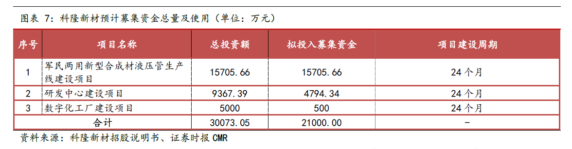 招股书披露,公司将拟使用近75%的募资用于“军民两用新型合成材料液压管生产线建设项目”,军民两用新型合成材料的研发,是公司顺应市场发展的必然选择。公司将坚持国家主导和市场运作、健全完善政策、打破行业壁垒、推动公平竞争、实现优胜劣汰,充分发挥公司在定制化橡塑新材料的研发和生产方面的技术积累、竞争优势,以提升公司在民用和军用新型合成材料液压管领域的服务能力和市场竞争力。