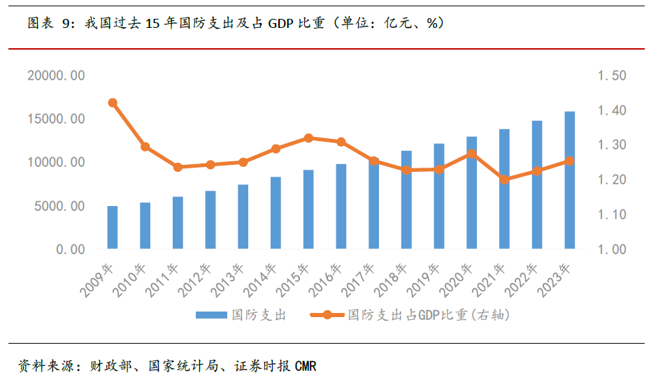 据财政部数据统计,我国国防支出一直保持适度稳定增长,2017年我国国防支出首次突破万亿元,2023年接近1.6万亿元,占GDP比重达到1.25%,创过去3年最高水平。