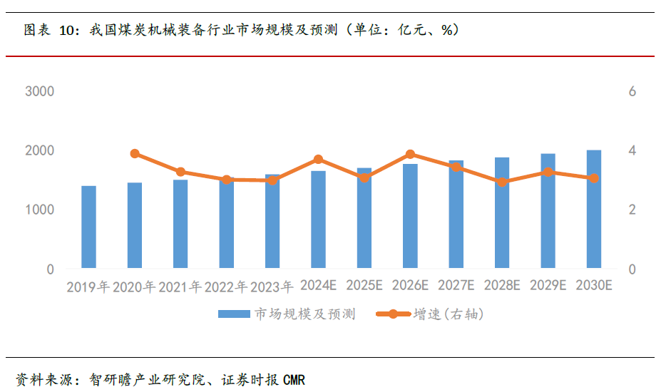 据智研瞻产业研究院数据,截至2023年我国煤炭机械装备行业市场规模约1591.59亿元,同比增长近3%,预计2030年有望突破2000亿元,自2023年至2030年复合增速有望达到3.33%,超过2021年至2023年增速。