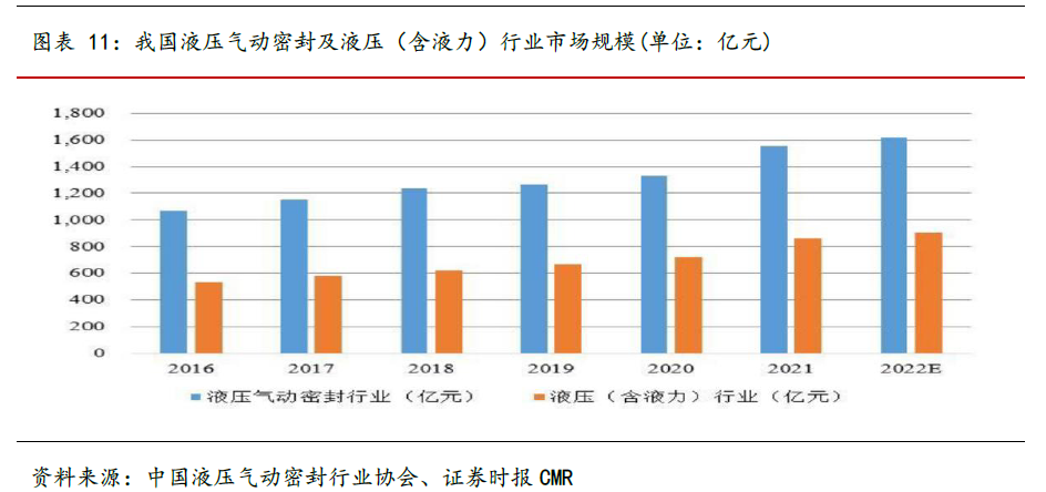 密封件的应用领域十分广泛,包括石油化工、煤化工、冶金、制药、食品、纺织、汽车、家电、工程机械及军工等国民经济各个领域。随着我国工业化进程的推进,液压气动设备市场规模的增长将带动密封件需求量同步提升,液压气动密封件行业市场规模较大。根据中国液压气动密封件工业协会数据,2021 年中国密封件行业市场规模约1571亿元,同比增长16.53%,2022年预计突破1600亿元。