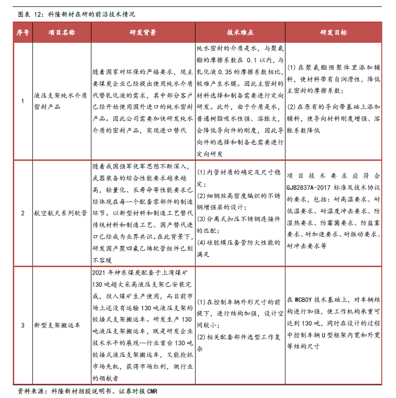 根据招股书披露,公司募投的“研发中心项目”完成后,研发中心将具备纯水密封产品、航空航天系列软管及支架搬运车等产品的研究与开发能力,同时建立较全面的产品性能检测试验室,建成后将有助于公司提高自主研发能力,提高产品质量和技术水平,增强公司的市场竞争力。该研发中心主要研究方向包括液压支架纯水介质密封产品、 航空航天系列软管、新型支架搬运车等,其中液压支架纯水介质密封产品已经进入中试阶段,随着国家对环保的严格要求,现主要煤炭企业已经提出使用纯水介质代替乳化液的需求,公司需要加快研发纯水介质的密封产品,实现进口替代;新型支架搬运车的研发将有助于公司抢抓市场先机,获得市场红利,做行业的领航者。
