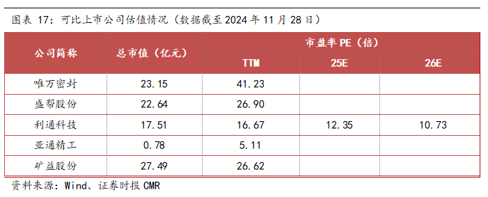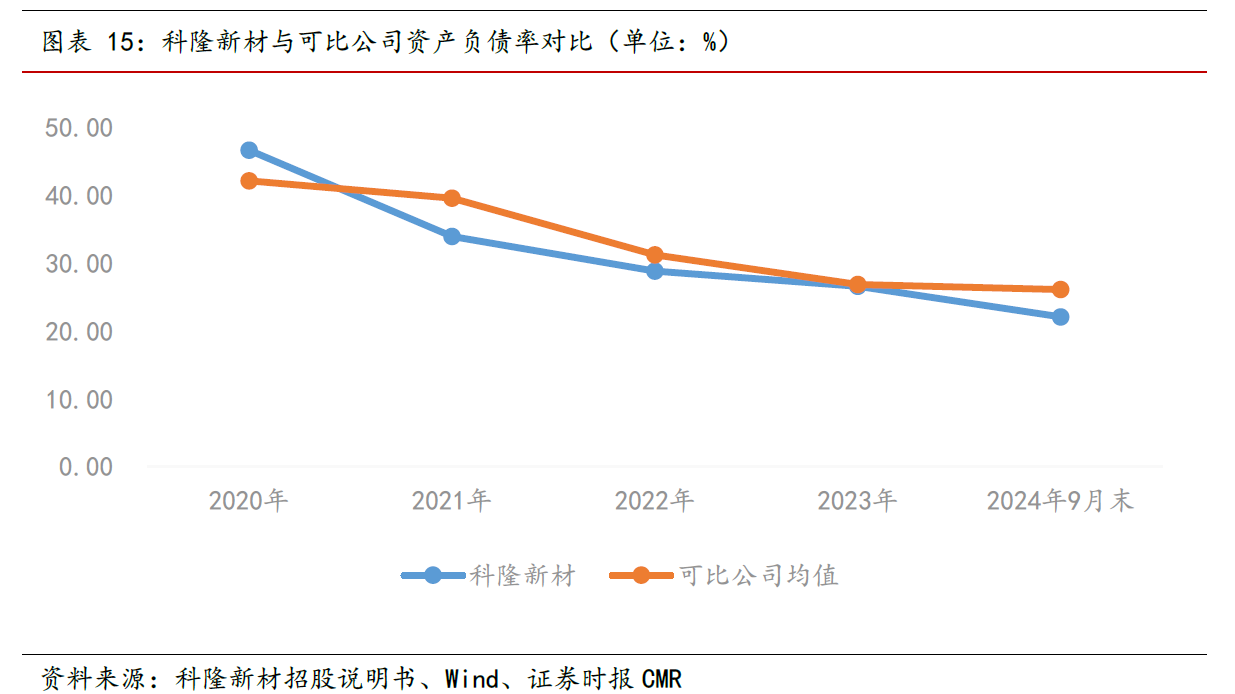 偿债能力稳定提升,负债及负债率双双下降。财务数据显示,公司负债和资产负债率保持下降趋势,截至2024年9月末,公司负债总额下降至2亿元以下,同期资产负债率下降至22.08%。与可比公司相比,公司资产负债率始终保持相对低位,最新负债率仅超过盛帮股份,低于亚通精工、利通科技等多家可比公司。