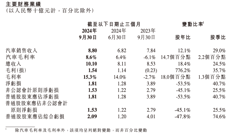 报告期内,公司总营收突破百亿元,同比上升18.4%,环比上升24.5%;由于成本降低及车型产品组合改善,毛利率大幅提升至15.3%,创下单季历史新高;第三季度净亏损18.1亿元,同比有所收窄,环比扩大。