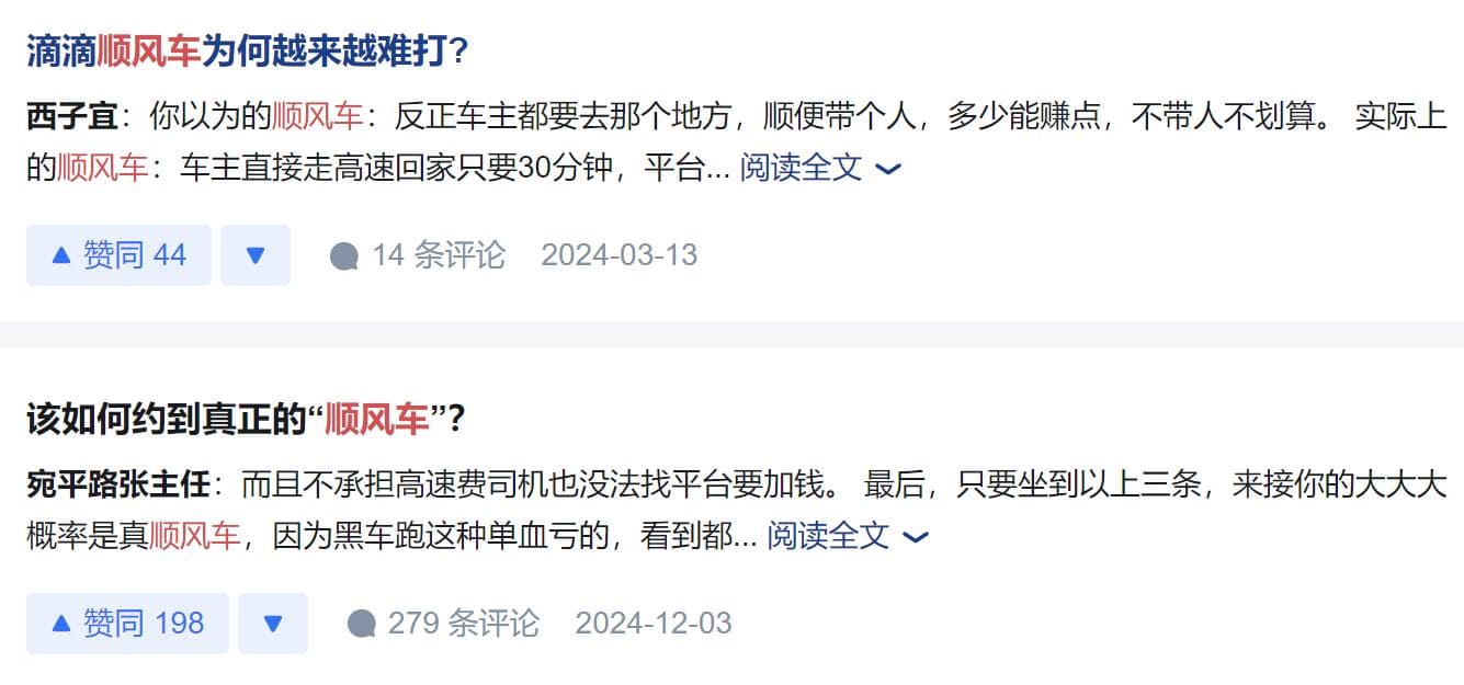 顺风车司机和乘客互相吐槽的情况由来已久,还有不少网友在知乎平台讨论“顺风车为何越来越难打”、“该如何约到真正的顺风车”等话题,甚至不少司机和乘客被气到发誓以后再也不开、再也不坐顺风车了。