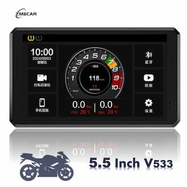 关于ZMECAR摩托车车载产品系列*n基础默认版:5英寸,Linux操作系统,F133处理器,支持蓝牙,无行车记录仪胎压监测系统(TPMS)内存;n高级版:7英寸,Android操作系统,8核处理器,支持蓝牙GPS WIFI 4G,配备行车记录仪胎压监测系统(TPMS)内存:4+64GB...价格请咨询我们。n1. ZMECAR摩托车导航产品,根据尺寸:5英寸、5.5英寸、6.25英寸、6.86英寸、7英寸;n2. 全防水IP67标准,蓝牙连接,手机互联(CarPlay Android Auto);n3. 不同CPU程序:V533或F133或四核或八核;n4. 操作系统:Linux OS或Android OS;n5. 可选功能:n行车记录仪功能:可观察屏幕前后的实时驾驶情况,观察周围环境,驾驶更安全,并可记录驾驶屏幕;n胎压检测系统(TPMS):实时检测胎压,保障您的安全;n可选遥控器可安装在方向盘上,通过按钮控制屏幕,操作简便,不分散注意力,保障您的驾驶安全;n部分产品可选配GPS 4G WIFI...我们设计了具有多种功能和配置的这一系列产品。请与我们联系以选择正确的配置。我们将为您提供最佳价格和培训服务,以帮助您的业务。