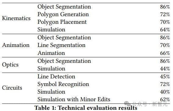 根据技术评估结果,不同模拟组件的成功率为:运动学为64%,光学为44%,电路为40%(62%经过轻微编辑后成功),动画为66%;其中对象分割的成功率高达86%