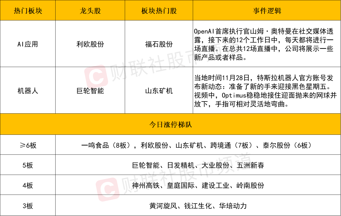 个股层面来看,今日短线情绪持续活跃,全市场逾150股涨停或涨超10%,其中热点主要围绕在机器人与AI应用方向展开。高位连板股中,机器人概念悉数晋级,山东矿机、巨轮智能、日发精机、五洲新春等个股早早连板涨停,而尾盘阶段泰尔股份也成功上演“地天板”。而AI应用方向,利欧股份承接住了昨日近140亿的量能,录得7连板,而岭南股份、岩山科技等个股同样连板成功。